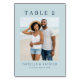 This wedding table card features a serene beach scene with a couple standing by the ocean, capturing a casual and joyful moment. The design uses a soft blue and white color palette that evokes a tranquil seaside atmosphere. Bold, uppercase sans-serif typography announces "TABLE 2" at the top, while elegant serif fonts display customizable names and date below the image. The layout is clean and balanced, with ample white space enhancing readability and visual appeal. Perfect for adding a personal touch to your beach-themed wedding reception.