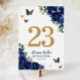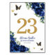 Personalize each of these beautiful royal blue floral table number cards easily and quickly. Simply click the Edit Using Design Tools button to further edit the text, change font style, color, size and move the image elements. Featuring vibrant royal blue flowers and gold butterflies. The butterflies are movable, resizable, duplicatable, and removable, allowing you to customize the design to suit your occasion. Great for Quinceañera, Sweet 16, bridal shower, debutante ball, birthday and many more occasions! Matching items available in store. (c) Somerset Fine Paperie