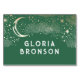 Tarjetas de mesa personalizables con nombres de invitados con tema celestial de noche estrellada y luna creciente.