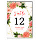 This beautiful and elegant wedding table number sign features watercolor coral pink red roses and foliage on a gold geometric frame. The text combines handwritten script and serif fonts for a stylish and modern look. This is perfect for a spring or summer rustic wedding.
