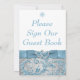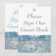 Continúe el tema de su boda de Navidad o invierno con esta elegante tarjeta de recuerdo de mesa para libro de invitados de boda con patrón de damasco de brillo falso de flores gris plateado y azul hielo de 5"x7" de doble cara que tiene un fondo de copos de nieve blancos dispersos y una cinta y lazo de acero azul impresos con un par de joyas de diamantes y corazones unidos con brillo azul falso en ella. Sería perfecta para un tema de país de las maravillas de invierno o para una boda de Navidad o Nochevieja. ***POR FAVOR TOME NOTA de que no hay elementos en relieve en esta invitación. Todo está impreso plano. Está mostrado aquí en papel básico, pero podría sostenerse fácilmente por sí solo en un caballete con el papel premium de triple grosor. ***POR FAVOR TOME NOTA de que si cambia las fuentes o el tamaño de las fuentes, puede alterar la forma en que se imprime su tarjeta. Se imprimirá tal como lo ve en su monitor, así que si tiene problemas de alineación o problemas de tamaño, por favor contácteme para obtener ayuda ANTES de realizar su pedido. No veré su tarjeta una vez que la ordene, y Zazzle NO editará nada (errores tipográficos, alineación, etc