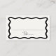Añada un toque elegante a su recepción de bodas o evento especial con estas modernas tarjetas de boda Wavy Frame. El diseño retro muestra "Table" en un guión negro manuscrito con espacio para que escriba el nombre y el número de tabla de su invitado. Un borde ondulado negro rodea el diseño contrastando con un fondo de marfil claro. La parte posterior de la tarjeta de lugar plana incluye sus nombres y la fecha del boda en negrita con letras negras.