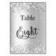 El número de tabla se escribe con un guión elegante de estilo con letras a mano. Letras negras, fondo blanco en el frente y fondo falso plateado con polvo falso purpurina, destellos en la espalda.