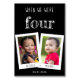 Una forma moderna y más original de personalizar los números de mesa con fotos de la infancia de la novia y el novio a esa edad (por defecto es cuatro). Las fotos de marcador de posición de una niña (la novia) y un niño (el novio) tienen bordes blancos retro, superpuestos, en la mitad inferior. Los nombres de la novia y el novio están escritos en los bordes blancos inferiores de las fotos. En la parte superior, está el mensaje "cuando teníamos cuatro años" con la edad escrita en letras grandes blancas como tiza y el resto arriba, en letras mayúsculas blancas más pequeñas (letras de mano). En la parte inferior, debajo de las dos fotos, está la fecha, también escrita como en tiza blanca. El fondo es negro.