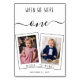 Una forma moderna y más original de personalizar los números de mesa con fotos de la infancia de la novia y el novio a esa edad numérica (por defecto es uno). Las fotos de marcador de posición de una niña (la novia) y un niño (el novio) tienen bordes blancos retro, superpuestos, en la mitad inferior. Los nombres de la novia y el novio están escritos en los bordes blancos inferiores de las fotos. En la parte superior, está el mensaje "cuando teníamos [edad]" con la edad escrita en una letra moderna. En la parte inferior, debajo de las dos fotos, está la fecha. El texto es negro, el fondo es blanco.