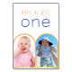 Una forma moderna y más original de personalizar los números de mesa con fotos de la infancia de los novios a esa edad (por defecto es uno). Las fotos de marcador de posición de una niña (la novia) y un niño (el novio) están en marcos de arco dorado falso, en la mitad inferior. En la parte superior, está el mensaje "cuando teníamos un año" con la edad escrita en azul marino y el resto encima, en mayúsculas doradas más pequeñas (letras a mano).