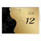 Tarjeta de número de mesa de lujo en oro y negro con remolinos florales. Esta es la línea de productos bodas "Luxury Gold-Black":
