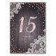 Elegante encaje blanco vintage y brillante purpurina rosa sobre un oscuro fondo rústico de madera de granero. magníficas tarjetas de mesa boda para boda rústico, boda de granero y boda campestre. Vea todas las piezas coincidentes de la colección.