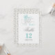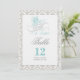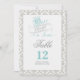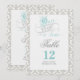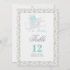 Tarjeta de números de mesa de Érase una vez con esquema de color aqua, gris, blanco y negro sobre un fondo damasco.