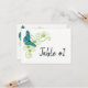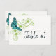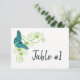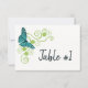 Mesas de recepción con una Verde azulada tarjeta de mesa de la recepción floral de mariposa. El diseño de la tarjeta de mesa incluye una mariposa verde azulada que descansa sobre flores y flores de color verde brillante. También hay material de boda adicional disponible con este diseño.