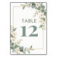 Delicate Romantic Flowers and Eucalyptus Branches Frame Wedding Table Number Cards with Soft Pastel Design.