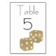 Esta glamorosa tarjeta personalizado número de mesa tiene un diseño de casino dorado y blanco. Una imagen de grandes dados purpurinas dorados se imprime en el centro sobre un fondo blanco. Puede personalizar la tarjeta de tabla para incluir su propio nombre o texto personalizado.