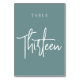 Las tarjetas de número de tabla simples y de moda en agua verde azulada polvorienta y blanco hacen una declaración elegante en su boda o evento. Las funciones de diseño "table [number]" se encuentran en una mezcla de letras clásicas de sif y manuscritas. El diseño se repite en ambos lados. Las tarjetas numeradas individualmente se venden por separado; solicite cada número de tabla individualmente de nuestra colección.