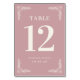 This elegant wedding table card features a soft pink background with a centered, bold numeral "12" in white serif font. The design includes decorative flourishes resembling stylized branches at each corner, adding a touch of sophistication. Customizable text fields allow for personalization with names and dates, making it perfect for a formal event. The overall layout is balanced and harmonious, conveying a refined and welcoming tone ideal for celebrating special moments.