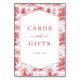 This elegant wedding tabletop sign features a classic design with a central rectangular frame outlined in red, showcasing the words "CARDS and GIFTS" in bold serif typography and "THANK YOU" in a lighter weight. The background is adorned with intricate pastoral scenes in a deep red hue, creating a charming and traditional look. The overall color palette of red and white enhances the sophisticated aesthetic, making it perfect for expressing gratitude at formal occasions. The detailed illustrations evoke a sense of nostalgia, ideal for adding a touch of refinement to your event decor.