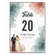 Este elegante número de mesa de boda floral acuático es perfecto para un boda moderno. El diseño romántico presenta un elegante marco floral acuático con un ilustracion de novia y novio y una caligrafía negra sobre un fondo blanco.