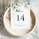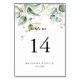Este elegante número de mesa boda de caligrafía dorada es perfecto para un boda sencillo. El diseño presenta oro de mano y hojas de eucalipto botánico verde, inspiradoras de belleza artística. Este es un número de tabla de doble cara. Agregue cada número de tabla que necesite a su carrito individualmente.