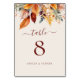 El elegante número de la mesa Boda de otoño de las hojas de otoño presenta un hermoso ramo de hojas de otoño en roya, amarillo, oro, mostaza, marrón y morado.
