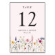 Elegantes tarjetas bodas florales con números de mesa con flores de acuarela y follaje en tonos rosa, amarillo, violeta, azul y verde que bordean el fondo del diseño con un fondo rosa rubor. El diseño se repite en la parte posterior. Las rústicas tarjetas de mesa de boda de flores silvestres son perfectas para bodas de primavera y verano. Para solicitar las tarjetas de tabla: agregue su nombre, fecha de boda y número de tabla. Agregue cada número a su carrito individualmente y desprotéjase cuando haya terminado.