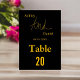 Este elegante número de mesa boda negro y dorado es perfecto para un boda moderno. el diseño es sencillo y elegante, con una caligrafía dorada sobre un fondo negro.