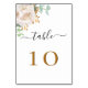 Un fondo blanco moda. Decorada con un rosa de color blanco acuático y hojas de eucalipto verde, brotes, vegetación, hojas de oro falsas. Personalice y sus números de tabla. Letras negras y doradas.