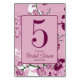 Flores de cerezo elegantes, también llamadas sakura, tarjeta de número de la mesa de la ducha de novia. Flores rosa delgadas con flores modernas de cerezo blanco y burdeos compensan la sombra. Fondo rosa