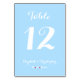 Crea tu propio personalizado, personalizado, elegante, elegante, hermoso guión de tipografía blanca, moderna moda azul claro y blanco, tarjeta de número de mesa de alta calidad, con los nombres de la novia y del novio y la fecha boda. Perfecto para bodas, duchas de novias, celebraciones de aniversario, fiesta de cena u otra ocasión especial. Para el personalizar, simplemente escriba el número de la tabla, el nombre de la pareja (novia y novio/marido y mujer) y la fecha del aniversario del boda/matrimonio.
