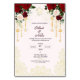 Una hermosa tarjeta de invitación a compromiso con un borde floral de rosas rojos y blancos, con un pequeño ilustracion de Ganesha en la parte superior. La tarjeta anuncia el compromiso de Hitesh y Neha, programado para llevarse a cabo el domingo 7 de marzo de 2030, a las 11 am en "123 Anywhere St., Any City, ST 12345." La invitación incluye una solicitud a RSVP antes del 15 de febrero y proporciona un número de contacto. El diseño también incorpora motivos indios tradicionales como decoración colgante y un borde de la parte inferior inspirado en la mandala