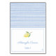 Este diseño se vende como una tarjeta plana de 3.5x5 pulgadas que deberás doblar (o partirse y doblar) a la mitad para hacer tarjetas individuales o bufés con un tamaño plegado de 3.5x2.5 pulgadas. Este diseño clásico cuenta con un limón acuarela con hojas, con rayas adhesivas de color azul medio y blanco en el reverso.