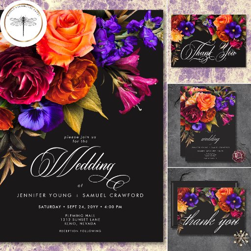 Disfrute de la belleza opulenta de una cosecha floral de otoño con nuestra cautivadora tarjeta de cercado de detalles bodas. El telón de fondo negro, dramático y suave, es el lienzo perfecto para un ramo increíblemente realista. Imaginen una vibrante explosión de color, con rosas en naranja y magenta oscuro, con pequeñas flores magenta rosa y violetas moradas y junto a mamáes de melocotón y otras florales vibrantes. El frondoso follaje verde oscuro completa el conjunto, añadiendo un toque de elegancia natural. Este diseño cautivador es perfecto para cualquier temporada, reflejando la apasionada intensidad de tu historia de amor. Los detalles de su boda se muestran en un guión elegante, asegurándose de que se destacan bellamente en el contexto dramático. Este encantador diseño crea una invitación inolvidable para celebrar su día especial. Creado por Simply Farmhouse Press.