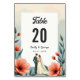 Este elegante número de mesa de boda floral acuático es perfecto para un boda moderno. El diseño romántico presenta un elegante marco floral acuático con un ilustracion de novia y novio y una caligrafía negra sobre un fondo blanco.