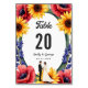Este elegante número de mesa de boda floral acuático es perfecto para un boda moderno. El diseño romántico presenta un elegante marco floral acuático con un ilustracion de novia y novio y una caligrafía negra sobre un fondo blanco.