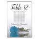 Estas tarjetas de número de mesa te permitirán encontrar fácilmente tus asientos en la recepción de tu boda. Presentan un diseño sencillo pero elegante con caligrafía de escritura de encaje y un único rosa azul cielo, turquesa o azul azul azulado que se encuentra a su lado con ondas de ondas y reflejos. La tarjeta incluye una tabla de asientos con 10 nombres. También hay espacio para los nombres de la pareja y la fecha de boda.