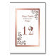 Un elegante rosa de oro/cobre embellecido con un sencillo número de mesa de boda blanco.