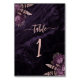 Esta elegante tarjeta numero de mesa de bodas tiene ramos de flores moradas, adornados con rosas de color oro falso Relieve metalizado en dos esquinas, en una imagen de fondo de agate color morado. El texto del personalizable incluye la palabra "tabla" y un número editable en letra de escritura a mano rosa rosa.
