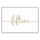 Tarjeta blanca con texto dorado, número de guión manuscrito número quince/15 tarjeta de la mesa de recepción de bodas.