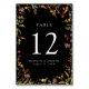 Elegante tarjeta de boda de flores silvestres con el número de la mesa, sus nombres y fecha boda mostrada con letras verdes rodeadas de un marco de flores acuarelas y follaje en tonos dorados, amarillos, rosados y morados con un fondo negro. Las tarjetas de la mesa de las flores silvestres acuáticas son perfectas para los bodas de primavera y verano. Para solicitar las tarjetas de tabla: agregue su nombre, fecha de boda y número de tabla. Agregue cada número a su carrito individualmente y desprotéjase cuando haya terminado.