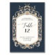 NAVY AZUL DOSCILADO CON NÚMEROS DE MESA DE RECEPCIÓN DE BODA DE ORO - Marco barroco victoriano elegante de aspecto dimensional formal con diseño de patrones de damasco azul marino tono a tono. Personalizado con el nombre o número de su Mesa, su mensaje a sus invitados, los nombres de Bride y Groom y la fecha de boda. Todas las obras de arte fueron diseñadas gráficamente por la artista y diseñadora con licencia internacional, Audrey Jeanne Roberts ©