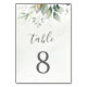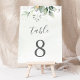 Bellos números de mesa de boda con eucalipto acuarela y hojas doradas. Una excelente opción para bodas al aire libre.