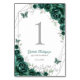 Emerald green silver and white Quinceanera celebration table number cards. Features, script font, silver butterflies, watercolor roses and tiara. Perfect for an elegant princess style glam celebration. Personalize with your own details. Printed Zazzle invitations or instant download digital printable template.
