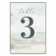 Esta tarjeta de mesa de boda presenta una escena de playa serena con texturas suaves de acuarela, creando un paisaje impresionista de azules pastel, verdes y beige arenosos. El diseño incluye un gran numeral "3" en gris oscuro negrita, complementado con tipografía cursiva elegante y sans-serif simple para un aspecto sofisticado. Las palmeras y las nubes tenues añaden ambiente tropical, mientras que el amplio espacio negativo asegura claridad y enfoque en los elementos centrales. Perfecta para bodas o reuniones formales, esta tarjeta combina atractivo estético con elegancia funcional, estableciendo un tono pacífico e invitador.