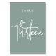 Las tarjetas de número de tabla simples y de moda en Eucalyptus Green y white hacen una declaración elegante en su boda o evento. Las funciones de diseño "table [number]" se encuentran en una mezcla de letras clásicas de sif y manuscritas. El diseño se repite en ambos lados. Las tarjetas numeradas individualmente se venden por separado; solicite cada número de tabla individualmente de nuestra colección.