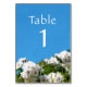 Hermosa tarjeta boda floral número de mesa con rosas blancas de ensueño y un cielo azul claro de verano.