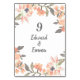 Número de mesa floral inspirado en vintage en colores albaricoque y verde. Decorado con flores y hojas suaves. Personalice el texto para cualquier ocasión. Boda de primavera, fiesta de compromiso, cumpleaños, baby shower y mucho más.