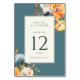 Elementos: flores audaces sobre un fondo teal. Sus nombres y detalles están enmarcados en un tono crema clásico. Colores: teal, verde, azul marino, crema, terracota, naranja, dorado, azul polvoriento. Temas: neutros frescos, clásico, contemporáneo, boho, bohemio, botánico, jardín. Colección: Colección de Tarjetas de Mesa Floral Boho Náutico Terracota Teal Elegante. Tipo de producto: Tarjeta de mesa