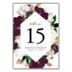 Elegantes tarjetas de números de mesa florales con detalles bodas rodeados por un marco geométrico de ciruela oscura y flores de acuarela blancas acentuadas por falsos Relieves metalizados de oro rosa y hojas verdes. El diseño se repite en la parte posterior. Diseñado para coordinar con nuestra colección de bodas Dark Plum Floral.