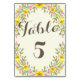 Esta rústica carta con el número de una mesa floral de moda rústica cuenta con hermosas flores acuáticas en flor, brotes de flores, hojas y follaje en bonitos de color rosa, amarillo y verde. El número de la tabla está escrito en un precioso guión de caligrafía y enmarcado por la corona floral.