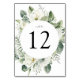 Elegantes tarjetas de mesa florales con el número de la mesa rodeado de un marco de flores pintadas de jardenia blanca, brotes de aliento de bebé, dahlias, hojas de helecho verde salado y hojas verdes vibrantes. El diseño se repite al revés. Diseñado para coordinar con nuestra colección de bodas de Flores Blancas y Verduras. Para ordenar este diseño, por favor personalizar los números de tabla uno por uno y añada al carrito individualmente.