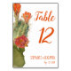 Números de mesa de boda con cactus acuarela con flores rojas a la izquierda y texto rojo naranja a la derecha. La palabra Mesa está escrita en un guión elegante, el resto en letras manuscritas.