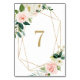 Número de Mesa de Flores Geométricas Acuarela Primavera | Número de mesa elegante y femenino con ilustraciones de acuarela de rosas y peonías blancas, melocotón y rosa, acentos de follaje y marco geométrico de lámina falsa. Este número de mesa floral es perfecto para eventos de primavera y jardín.